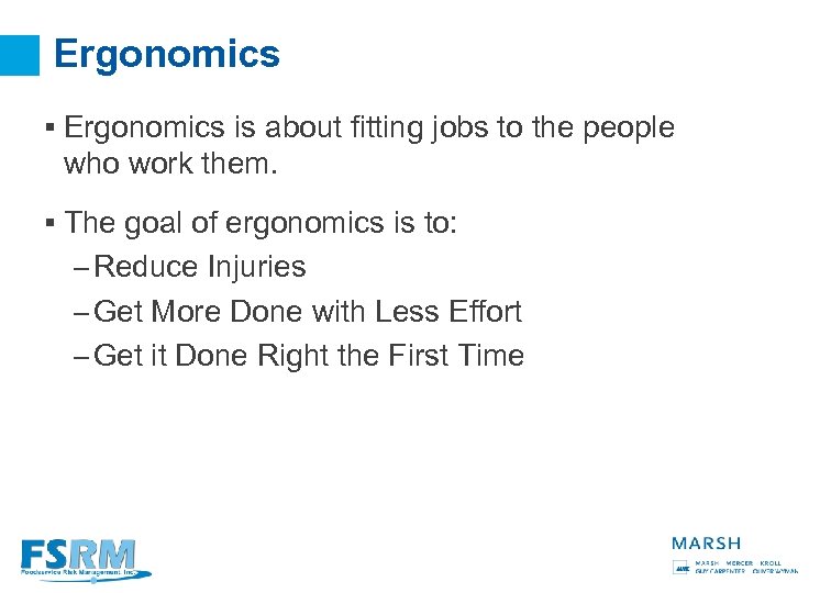 Ergonomics § Ergonomics is about fitting jobs to the people who work them. § The goal of ergonomics is to: – Reduce Injuries – Get More Done with Less Effort – Get it Done Right the First Time 9