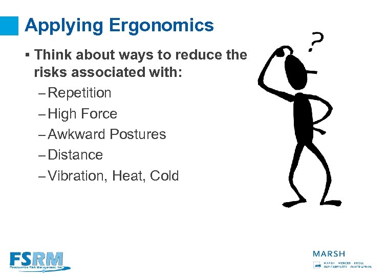 Applying Ergonomics § Think about ways to reduce the risks associated with: – Repetition – High Force – Awkward Postures – Distance – Vibration, Heat, Cold 10