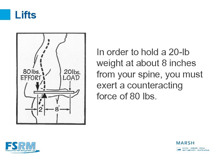 Lifts F 1 F 2 13 When lifting loads in work situations, you often need to extend your arms and slightly bend forward. The body center of gravity shifts forward and some of the weight of your upper body must also be taken into account. For example, in order to support a 20 -lb weight at 20 inches from the spine while leading forward, the counteracting force must be equal roughly to 400 lbs.