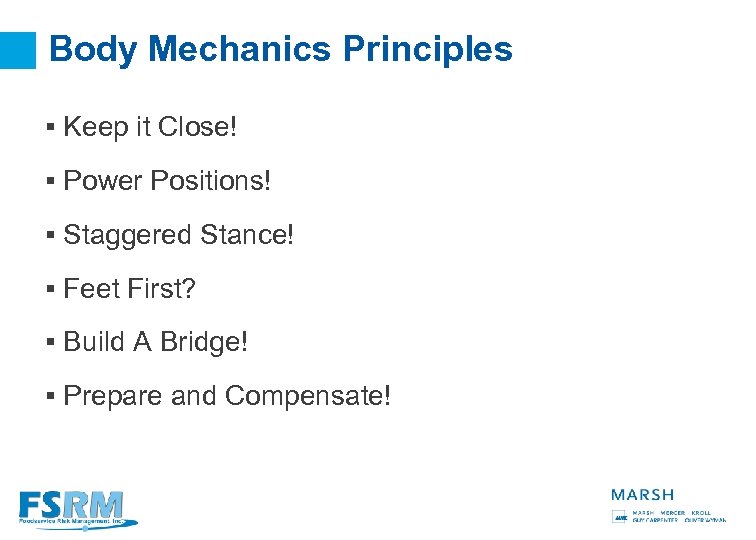 Body Mechanics Principles § Keep it Close! § Power Positions! § Staggered Stance! § Feet First? § Build A Bridge! § Prepare and Compensate! 20