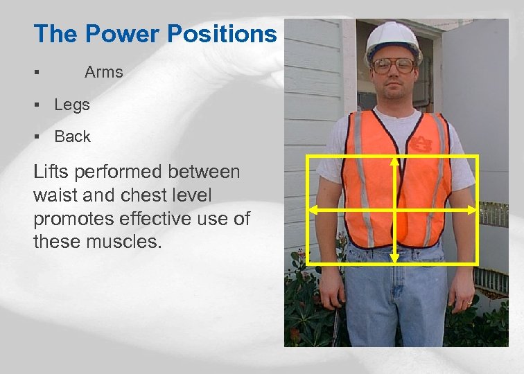 The Power Positions § Arms § Legs § Back Lifts performed between waist and chest level promotes effective use of these muscles. 22