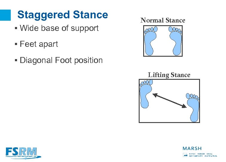 Staggered Stance § Wide base of support Normal Stance § Feet apart § Diagonal Foot position Lifting Stance 23