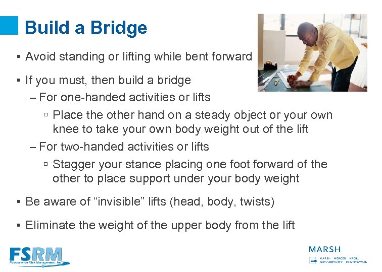 Build a Bridge § Avoid standing or lifting while bent forward § If you must, then build a bridge – For one-handed activities or lifts ú Place the other hand on a steady object or your own knee to take your own body weight out of the lift – For two-handed activities or lifts ú Stagger your stance placing one foot forward of the other to place support under your body weight § Be aware of “invisible” lifts (head, body, twists) § Eliminate the weight of the upper body from the lift 25