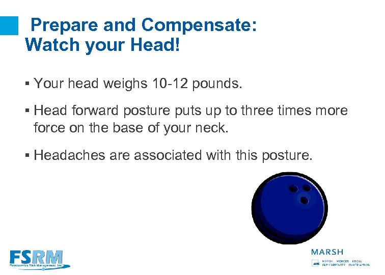 Prepare and Compensate: Watch your Head! § Your head weighs 10 -12 pounds. § Head forward posture puts up to three times more force on the base of your neck. § Headaches are associated with this posture. 27
