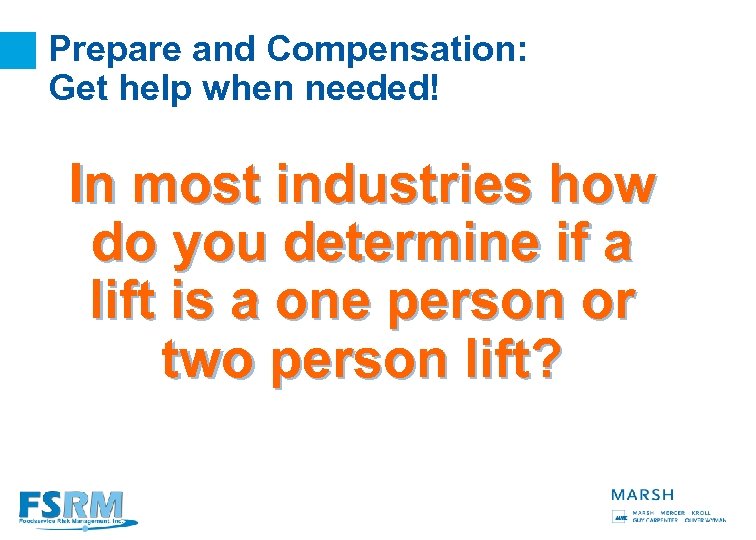 Prepare and Compensation: Get help when needed! In most industries how do you determine if a lift is a one person or two person lift? 29