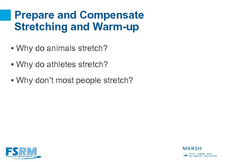 Prepare and Compensate Stretching and Warm-up § Why do animals stretch? § Why do athletes stretch? § Why don’t most people stretch? 33