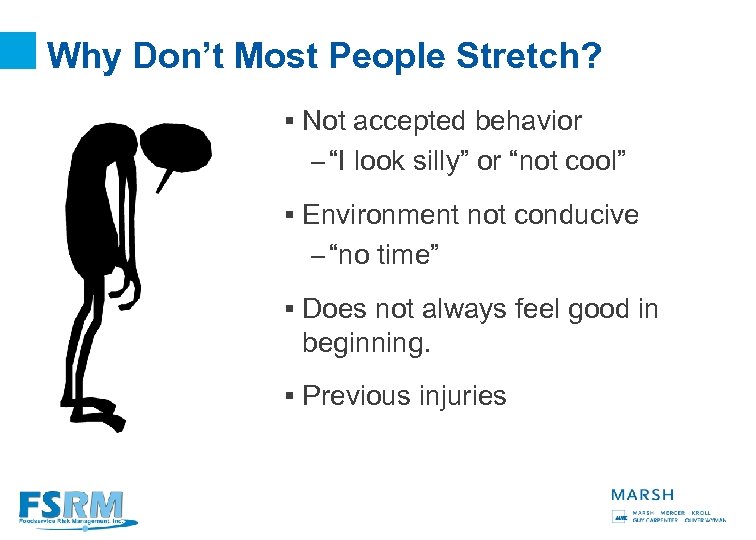 Why Don’t Most People Stretch? § Not accepted behavior – “I look silly” or “not cool” § Environment not conducive – “no time” § Does not always feel good in beginning. § Previous injuries 36