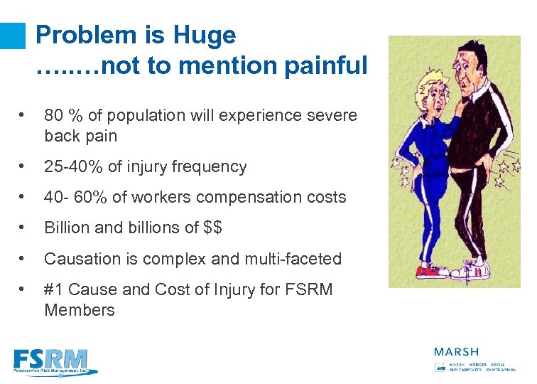 Problem is Huge …. . …not to mention painful • 80 % of population will experience severe back pain • 25 -40% of injury frequency • 40 - 60% of workers compensation costs • Billion and billions of $$ • Causation is complex and multi-faceted • #1 Cause and Cost of Injury for FSRM Members 3