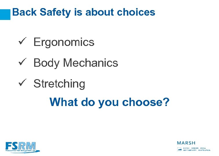 Back Safety is about choices ü Ergonomics ü Body Mechanics ü Stretching What do you choose? 39