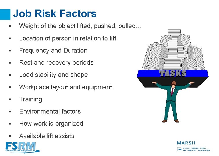 Job Risk Factors § Weight of the object lifted, pushed, pulled… § Location of person in relation to lift § Frequency and Duration § Rest and recovery periods § Load stability and shape § Workplace layout and equipment § Training § Environmental factors § How work is organized § Available lift assists 4