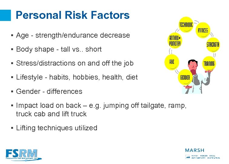 Personal Risk Factors § Age - strength/endurance decrease § Body shape - tall vs. . short § Stress/distractions on and off the job § Lifestyle - habits, hobbies, health, diet § Gender - differences § Impact load on back – e. g. jumping off tailgate, ramp, truck cab and lift truck § Lifting techniques utilized 5