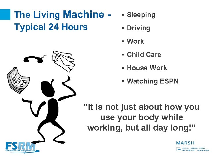 The Living Machine Typical 24 Hours § Sleeping § Driving § Work § Child Care § House Work § Watching ESPN “It is not just about how you use your body while working, but all day long!” 7