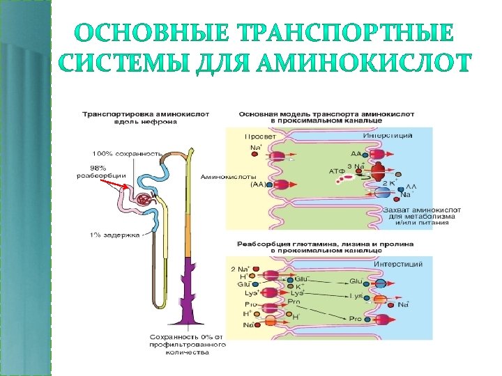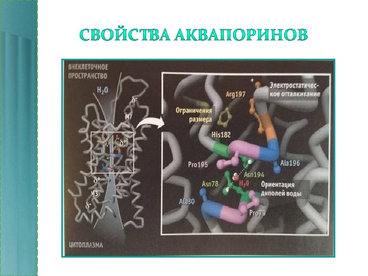 Свойства аквапоринов направлены на быстрый и селективный транспорт воды и ограничение транспорта ионов и протонизированной воды. Ограничения размера транспортируемых молекул. В области собственно поры устье достигает очень узкого размера (область сжатия). Проходимость сохраняется только для молекул воды по одиночке. • Электростатическое отталкивание. Положительно заряженные остатки Arg 197 препятствуют прохождению протонов и протонизированной воды (H 3 O+). • Ориентация диполей воды. Молекулы ориентированы (-)-полюсом по направлению к (+) полюсу аминокислот (Asn 78, 194) селективного фильтра. •