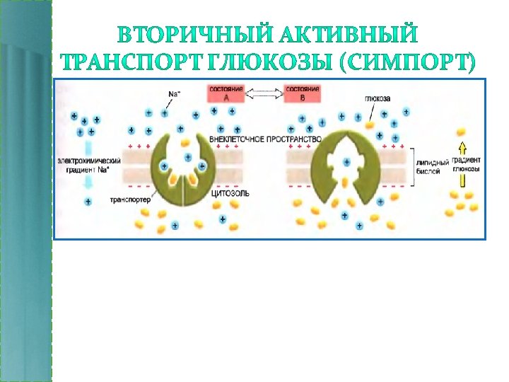 Конформационные изменения происходят случайно и не зависят от количества связанных сайтов. • Состояние А – сайты связывания с растворенным веществом обращены к внешней поверхности бислоя • Состояние В – сайты связывания обращены в цитозоль.