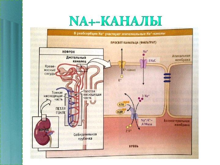 K+ - NA+ - АТФ-АЗА • Присутствует в плазмалемме почти всех эукариотических клеток • Поддерживает разницу концентраций K+ и Na+, активно откачивая Na+ и закачивая К+ против электрохимического градиента по типу АТР-зависимого антипорта. • Насос может работать в противоположном направлении – т. е. синтезировать АТР (в зависимости от относительных концентраций ATP, ADP, P и электрохимических градиентов K+ и Na+).