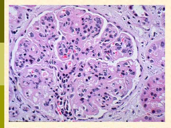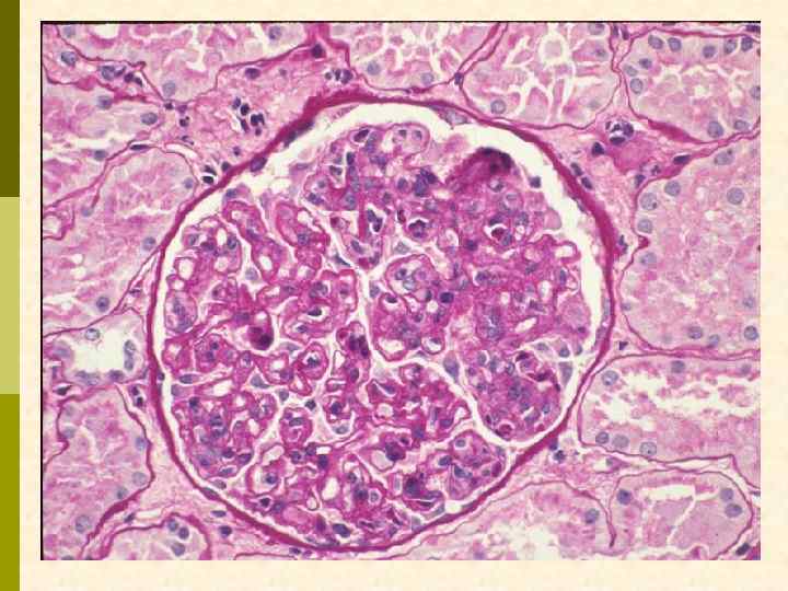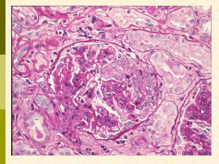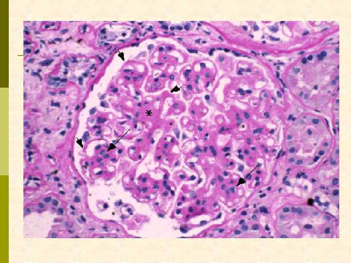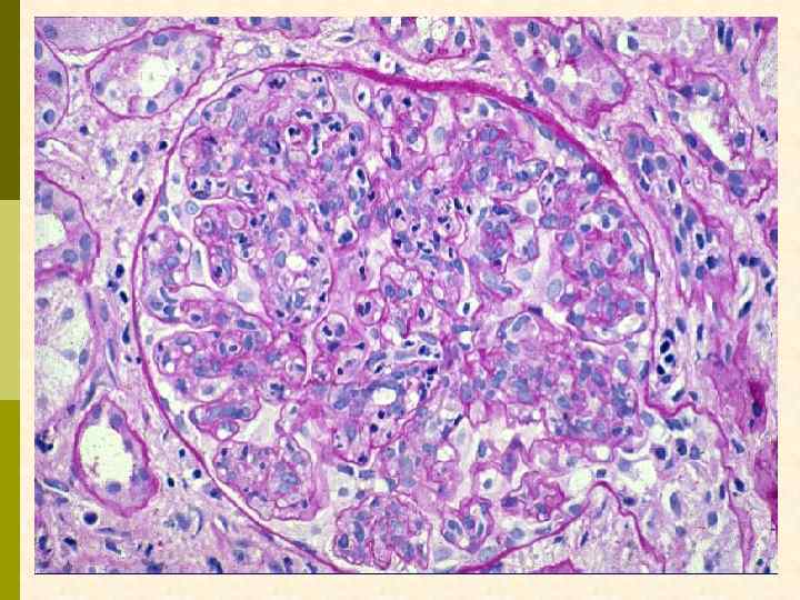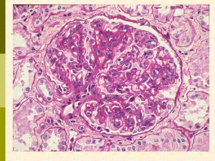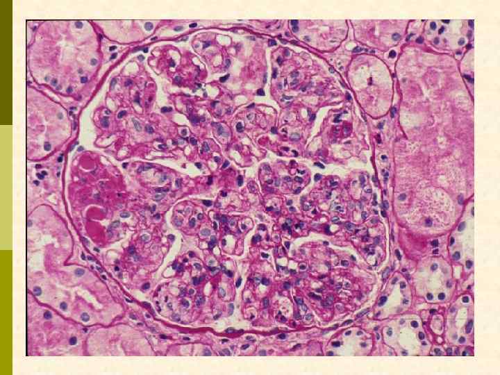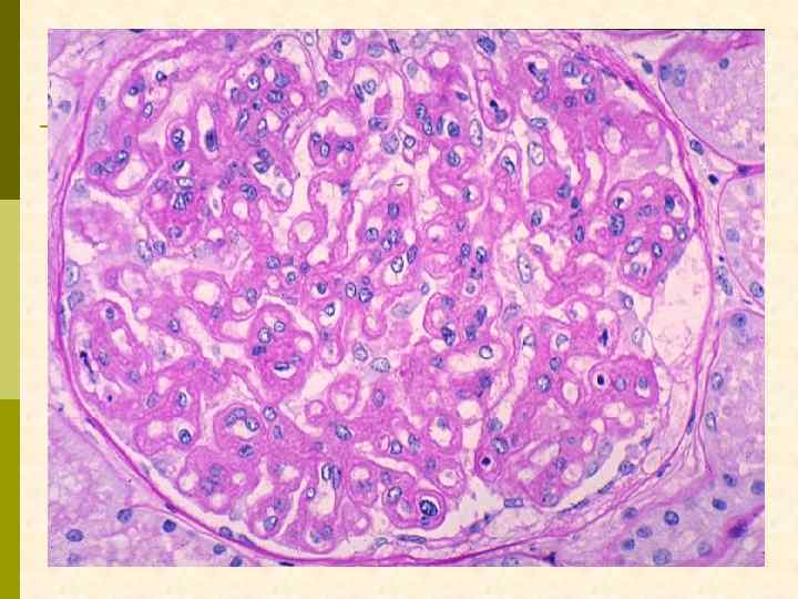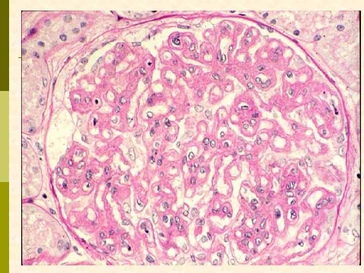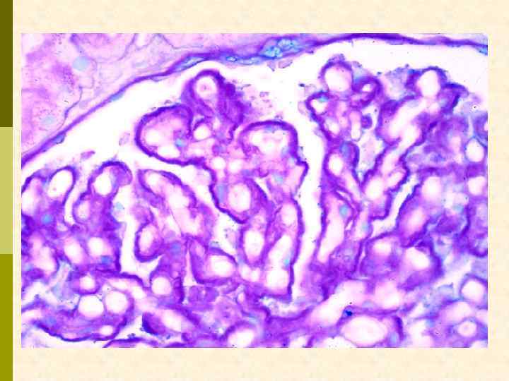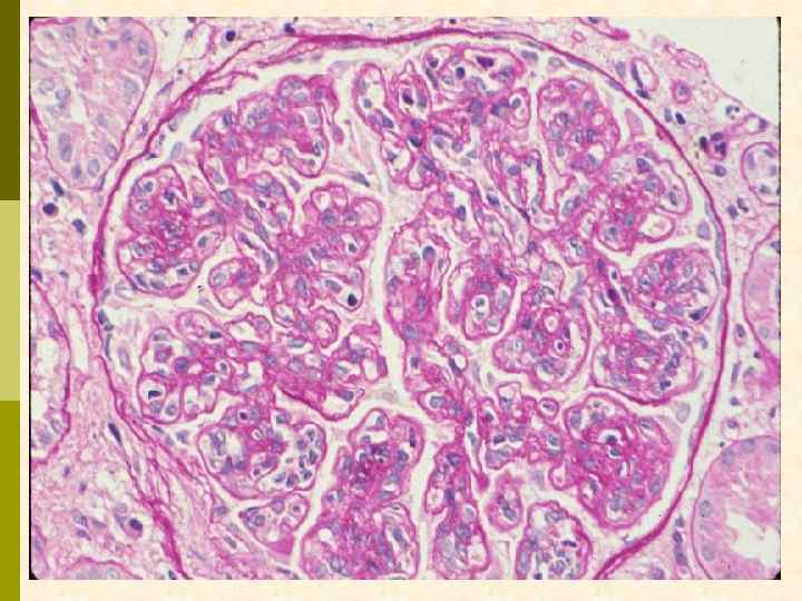 МЕМБРАНО-ПРОЛИФЕРАТИВНЫЙ ГЛОМЕРУЛОНЕФРИТ МОРФОЛОГИЧЕСКИЕ ПРИЗНАКИ гиперцеллюлярный клубочек утолщение капиллярной стенки СОСТОЯНИЯ, АССОЦИИРОВАННЫЕ С МЕМБРАНО-ПРОЛИФЕРАТИВНЫМИ ИЗМЕНЕНИЯМИ § Иммунокомплексные болезни § Тромботические ангиопатии § Болезни отложения парапротеинов
