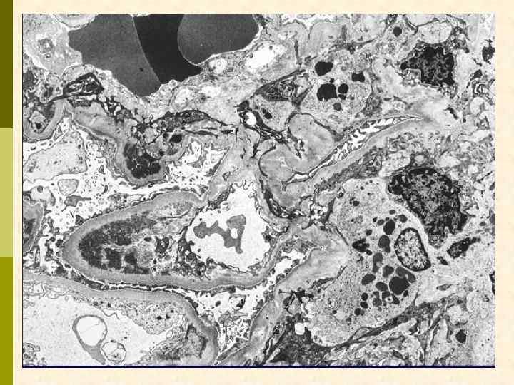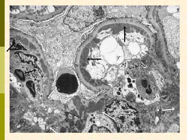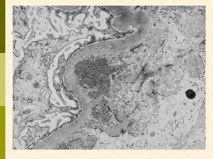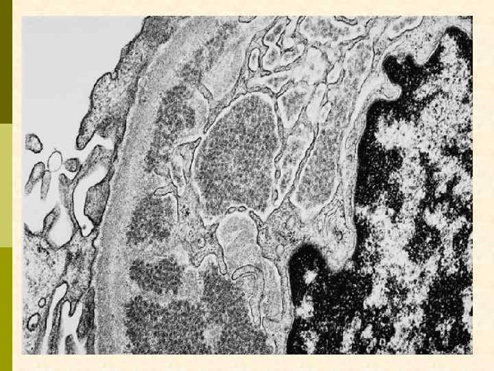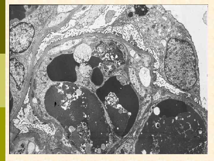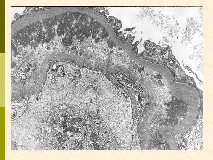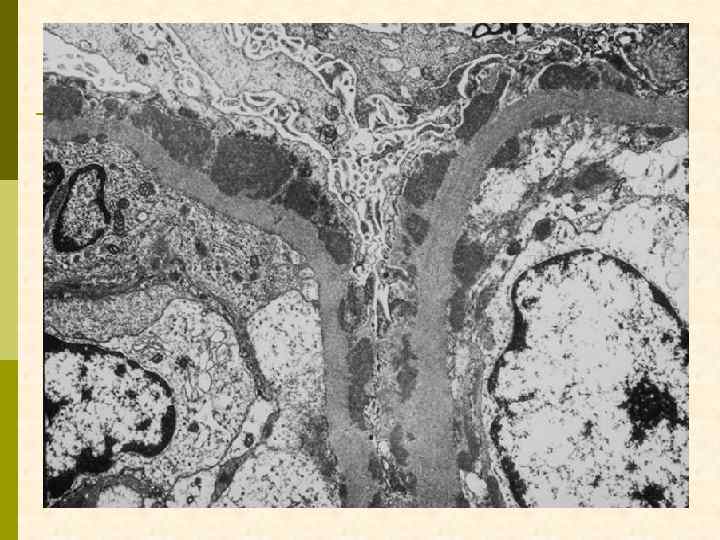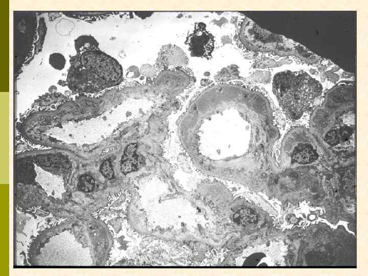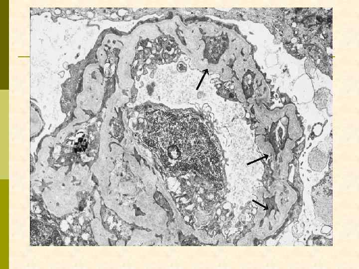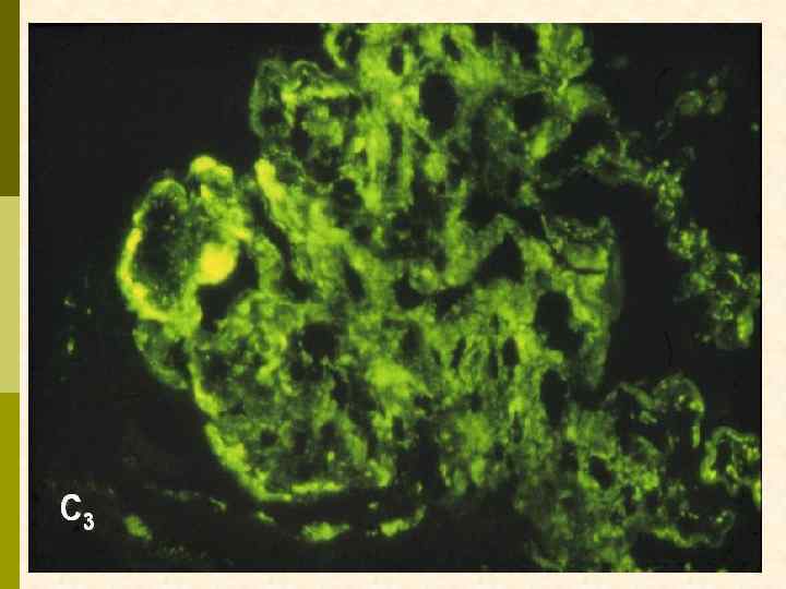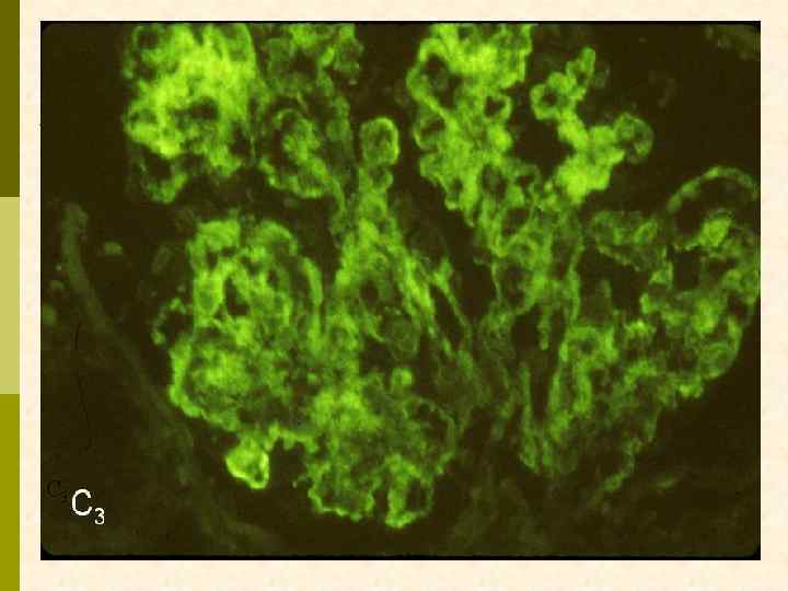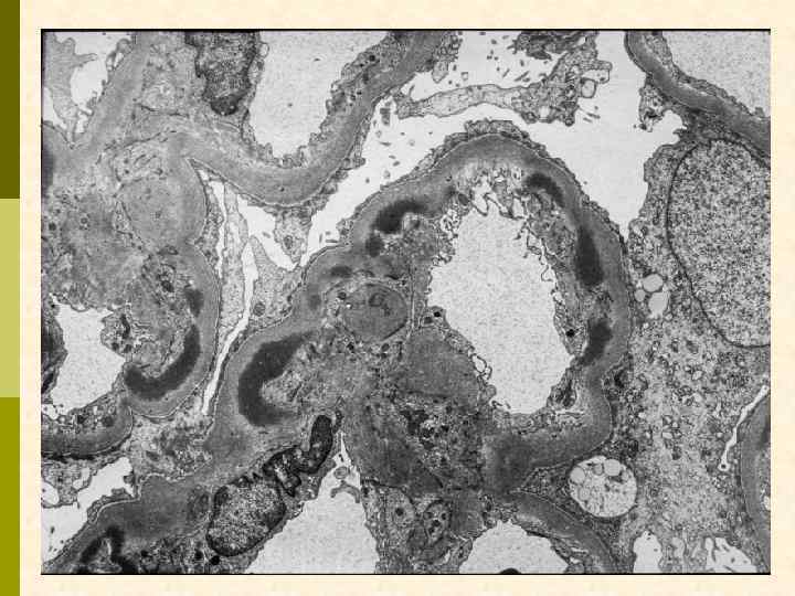 Гистологические варианты МПГН q q Тип I – хроническая иммунокомплексная болезнь q иммунные депозиты в мезангии и субэндотелии q ассоциируется с гепатитом С, смешанной криоглобулинемией, гепатитом В, бактериальным эндокардитом Тип II – болезнь плотных депозитов q q С 3 при иммунофлуоресценции, но без иммуноглобулинов аутоантитела к С 3 конвертирующему ферменту (C 3 Nef) в 90% случаев рецидивирует в трансплантате Тип III – хроническая иммунокомплексная болезнь q в отличие от I типа имеются субэпителиальные депозиты и разрушение базальной мембраны с прозрачными лакунами