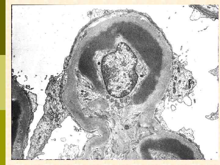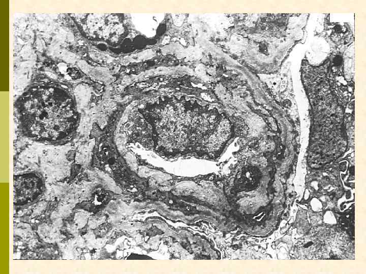 ХРОНИЧЕСКАЯ ТРОМБОТИЧЕСКАЯ МИКРОАНГИОПАТИЯ Ранние признаки: набухание эндотелиоцитов, потеря фенестр, отделение эндотелия от мембраны, заполнение субэндотелия электронно-прозрачным материалом (белки, участвующие в процессе свертывания + клеточный детрит), новообразование базальных мембран под смещенным эндотелием. Нефробиоптат больного первичным антифосфолипидным синдромом