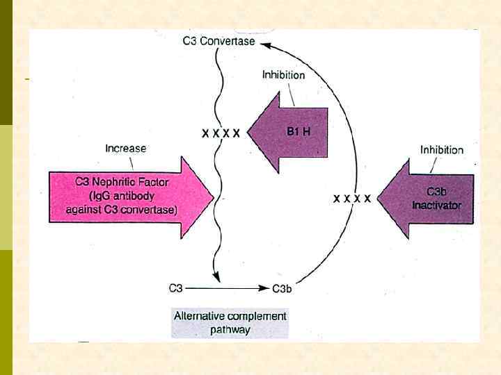 Гистологические варианты МПГН q Тип I – хроническая иммунокомплексная болезнь q иммунные депозиты в мезангии и субэндотелии q ассоциируется с гепатитом С, смешанной криоглобулинемией, гепатитом В, бактериальным эндокардитом q Тип II – болезнь плотных депозитов q С 3 при иммунофлуоресценции, но без иммуноглобулинов q аутоантитела к С 3 конвертирующему ферменту (C 3 Nef) q в 90% случаев рецидивирует в трансплантате q Тип III – хроническая иммунокомплексная болезнь q в отличие от I типа имеются субэпителиальные депозиты и разрушение базальной мембраны с прозрачными лакунами