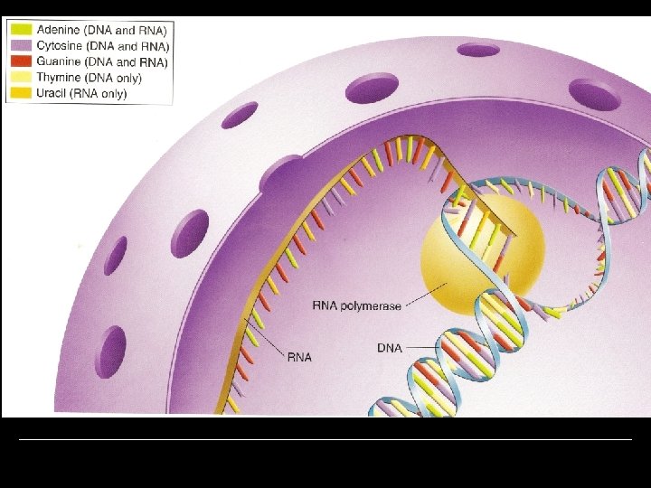 3 Types of RNA o Messenger RNA (m. RNA)—carries copies of instructions for assembling amino acids into proteins. o Ribosomal RNA (r. RNA)—contained in the ribosome where proteins are made. o Transfer RNA (t. RNA)—transfers amino acids to the ribosome; anticodon