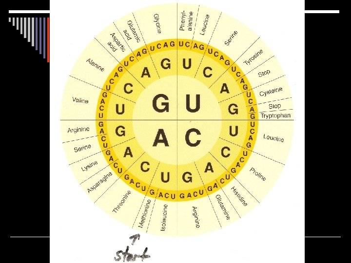 Codons o Codons are three-letter “words” in m. RNA o Three consecutive nucleotides code for an amino acid o There are 64 possible three-base codons for m. RNA (4 x 4 x 4=64)