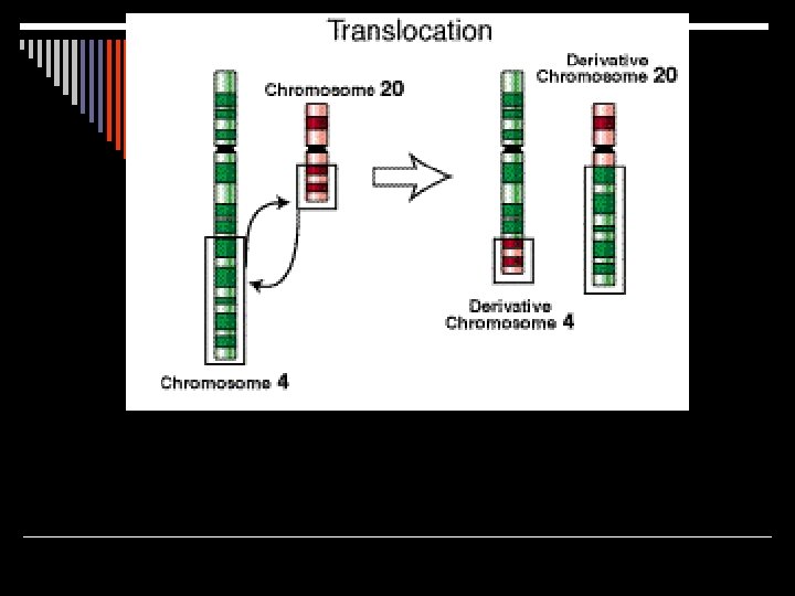 Chromosomal Mutations 4. Translocation: part breaks off and attaches to a non-homologous chromosome 5. Insertion: gain part of or a whole extra chromosome.
