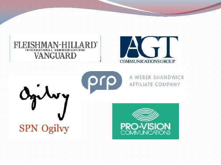 PR-агентства России o Fleishman Hillard Vanguard(совместное предприятие, созданное в 2007 году крупнейшей международной коммуникационной сетью Fleishman Hillard Inc (Omnicom Group Inc) и ведущим российским агентством Vanguard PR, основанным в Москве в 1993 году). o Pro Vision Communications o PRP Group o SPN Ogilvy o Коммуникационная группа АГТ