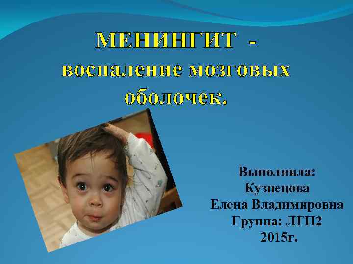 МЕНИНГИТ воспаление мозговых оболочек. Выполнила: Кузнецова Елена Владимировна Группа: ЛГП 2 2015 г.