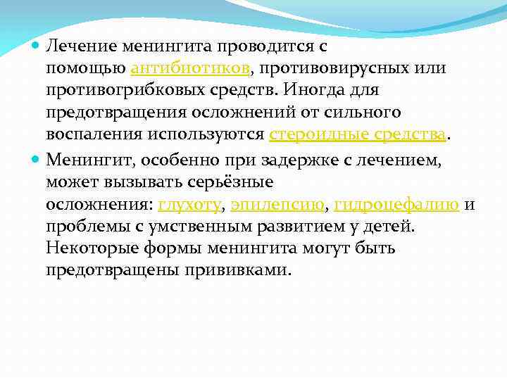 Лечение менингита проводится с помощью антибиотиков, противовирусных или противогрибковых средств. Иногда для предотвращения осложнений от сильного воспаления используются стероидные средства. Менингит, особенно при задержке с лечением, может вызывать серьёзные осложнения: глухоту, эпилепсию, гидроцефалию и проблемы с умственным развитием у детей. Некоторые формы менингита могут быть предотвращены прививками.