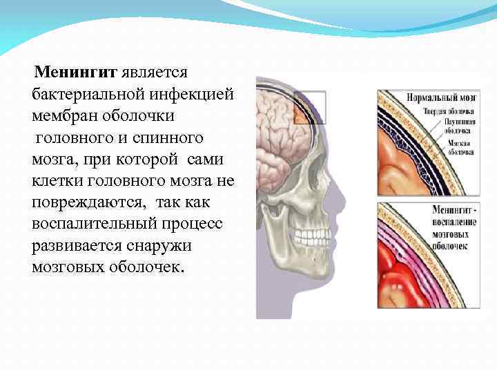 Менингит является бактериальной инфекцией мембран оболочки головного и спинного мозга, при которой сами клетки головного мозга не повреждаются, так как воспалительный процесс развивается снаружи мозговых оболочек.