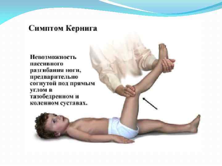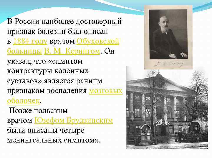 В России наиболее достоверный признак болезни был описан в 1884 году врачом Обуховской больницы В. М. Кернигом. Он указал, что «симптом контрактуры коленных суставов» является ранним признаком воспаления мозговых оболочек. Позже польским врачом Юзефом Брудзинским были описаны четыре менингеальных симптома.