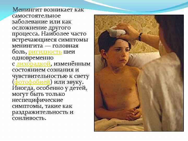 Менингит возникает как самостоятельное заболевание или как осложнение другого процесса. Наиболее часто встречающиеся симптомы менингита — головная боль, ригидность шеи одновременно с лихорадкой, изменённым состоянием сознания и чувствительностью к свету (фотофобией) или звуку. Иногда, особенно у детей, могут быть только неспецифические симптомы, такие как раздражительность и сонливость.