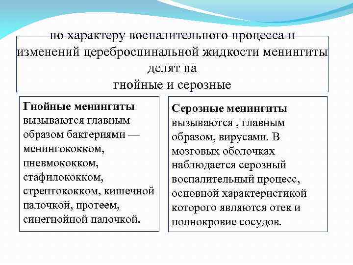 по характеру воспалительного процесса и изменений цереброспинальной жидкости менингиты делят на гнойные и серозные Гнойные менингиты вызываются главным образом бактериями — менингококком, пневмококком, стафилококком, стрептококком, кишечной палочкой, протеем, синегнойной палочкой. Серозные менингиты вызываются , главным образом, вирусами. В мозговых оболочках наблюдается серозный воспалительный процесс, основной характеристикой которого являются отек и полнокровие сосудов.