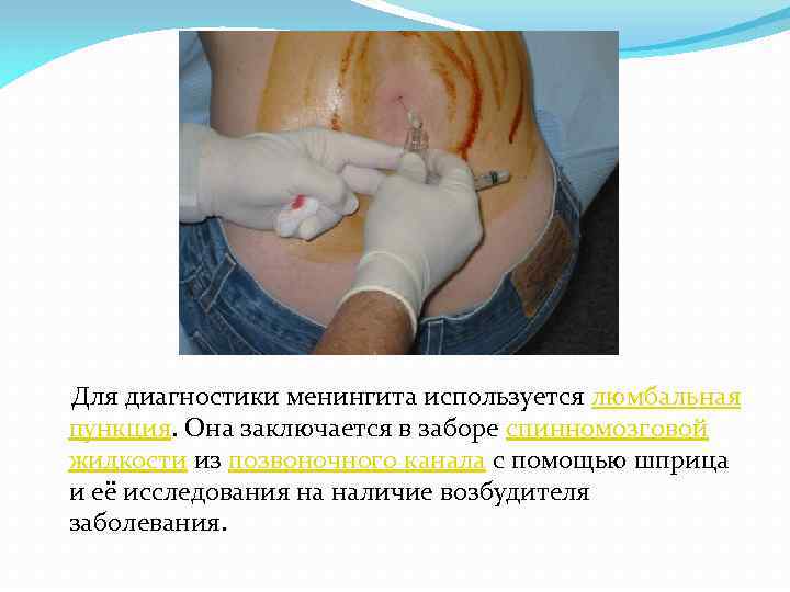 Для диагностики менингита используется люмбальная пункция. Она заключается в заборе спинномозговой жидкости из позвоночного канала с помощью шприца и её исследования на наличие возбудителя заболевания.