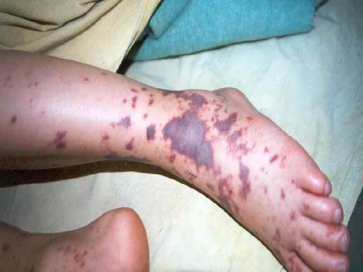 Молниеносная менингококцемия n n Сверхострый менингококковый сепсис, молниеносная пурпура, фульминантная менингококцемия, синдром Уотерхауса— Фридериксена. Острейшее начало с ознобом. Лихорадка до 40 -41°С, через несколько часов может смениться гипотермией. Уже в первые часы - обильная геморрагическая сыпь с тенденцией к слиянию и образованию обширных кровоизлияний.