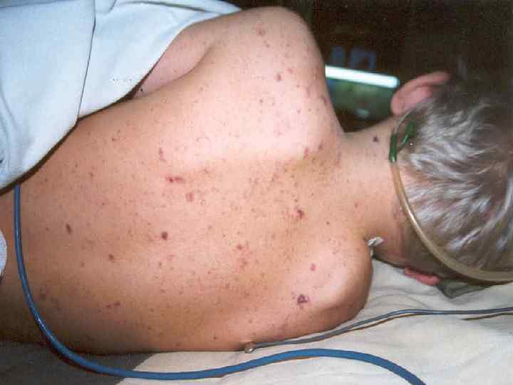 Шок II степени (субкомпенсированный). n Возбуждение сменяется заторможенностью, бледностью, акроцианозом. Сыпь крупная, с некрозами. Тахикардия, одышка, АД снижено не менее, чем на 1/3 от исходного уровня, составляя у нормотоников 85/60 -60/20 мм рт. ст. Олигурия.
