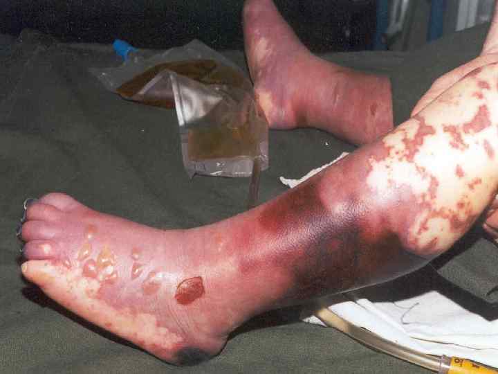 Дисбаланс свертывающей и противосвертывающей систем крови: вначале преобладает процесс гиперкоагуляции (увеличение содержания фибриногена и других факторов свертывания), затем выпадение фибрина в мелких сосудах с образованием тромбов. n Тромбоз крупных сосудов гангрена пальцев конечностей. n