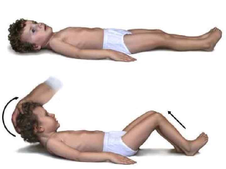 Менингеальные симптомы: n Описано около 30 менингеальных знаков. n Наиболее постоянны ригидность затылочных мышц, симптомы Кернига, Брудзинского (нижний, средний, верхний), а также Гийена, Бехтерева, Мейтуса. n У детей раннего возраста симптомы Кернига и Брудзинского могут носить физиологическими или отсутствовать при развившемся менингите. n У маленьких детей проводят «провокационные пробы» с целью выявить симптомы «подвешивания» (Лесажа), «треножника» и «поцелуя в колено» (Амосса), Мейтуса.