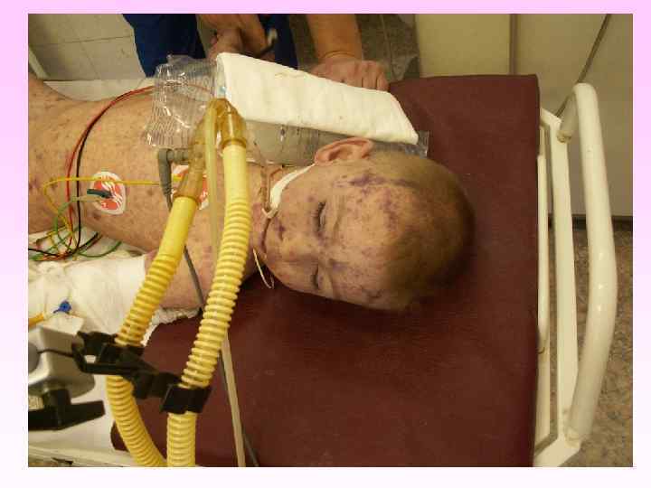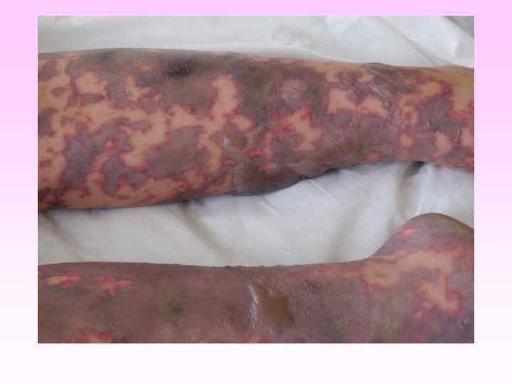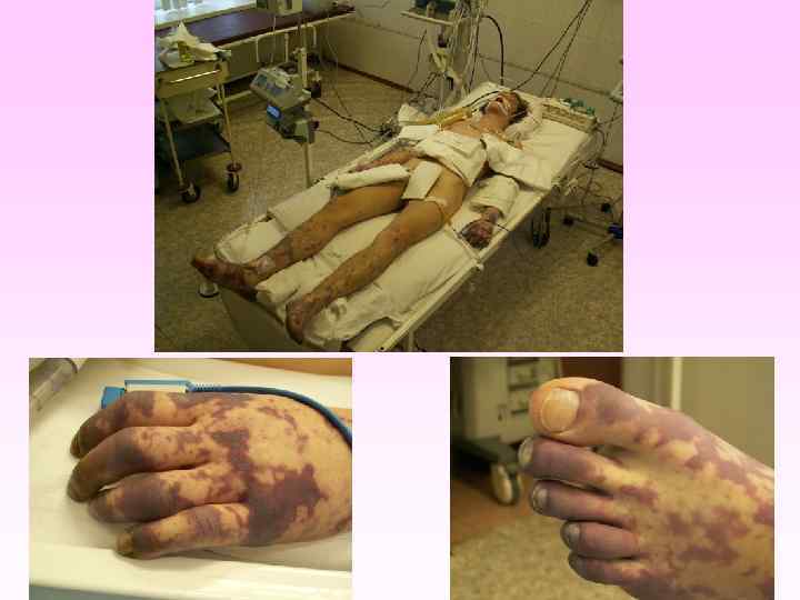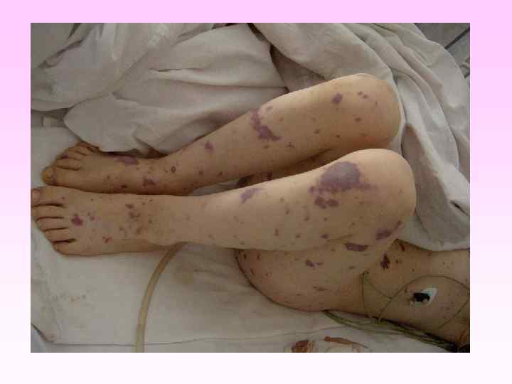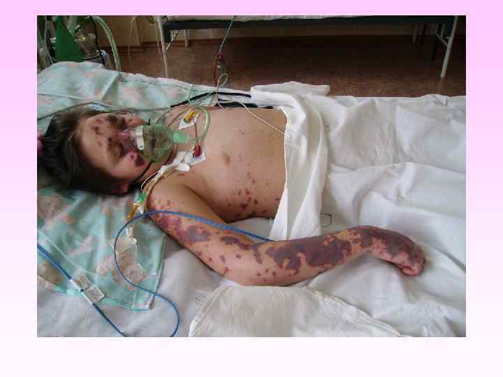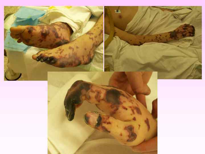 • • • заболевание развивается бурно, появляется озноб, боль в мышцах, суставах, в животе, рвота, жидкий стул, температура до 40 -41°С в первые 6 -8 часов появляется геморрагическая сливная сыпь с некрозами на лице, груди могут быть кровоизлияния в склеру, конъюнктиву, носовые, желудочные, почечные, маточные кровотечения. появляется резкая бледность с цианотичным оттенком, АД падает, пульс нитевидный, тахикардия более 140 ударов в минуту, одышка, нарушается сознание (острая надпочечниковая недостаточность или синдром Уотерхауза-Фридериксена) при прогрессировании заболевания на коже появляются крупные синие пятна ( «трупные пятна» ), перемещающиеся при перемене положения тела больного, судороги, развивается острая почечная недостаточность, анурия.