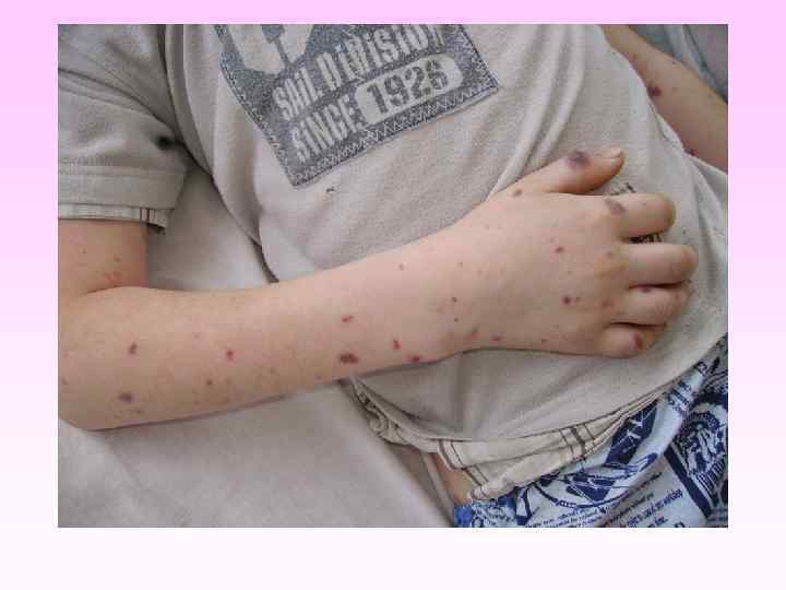 Генерализованные формы менингококковой инфекции • • • Менингококкемия составляет до 36 -43% среди всех случаев генерализованных форм менингококковой инфекции. острое начало, с подъема температуры до высоких цифр, развитие синдрома токсикоза, появление геморрагической звездчатой сыпи с некрозами на коже. вялость, гиперестезия кожи, головная боль, рвота, снижение аппетита, тахикардия, одышка диспептические явления при тяжелых формах - возбуждение или заторможенность, спутанность сознания геморрагическая звездчатая сыпь (элементы сыпи при МИ могут быть различного размера (от петехий до экхимозов), неправильной формы, плотные с инфильтрированным основанием, не исчезают при надавливании, при соскобе из них можно выделить менингококк) М. б. розеолезная, папулезная, пятнистая сыпь, на фоне которой можно обнаружить отдельные геморрагические элементы, оставляющие после себя пигментацию. Излюбленная локализация сыпи - боковая поверхность и низ живота, ягодицы, бедра, голени и стопы