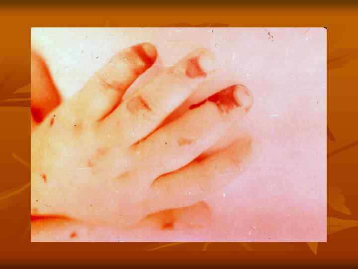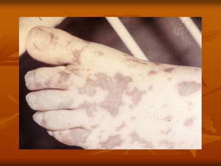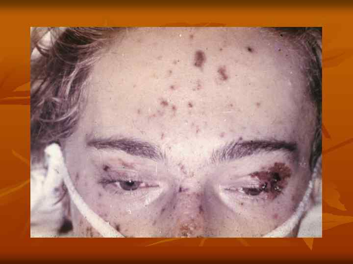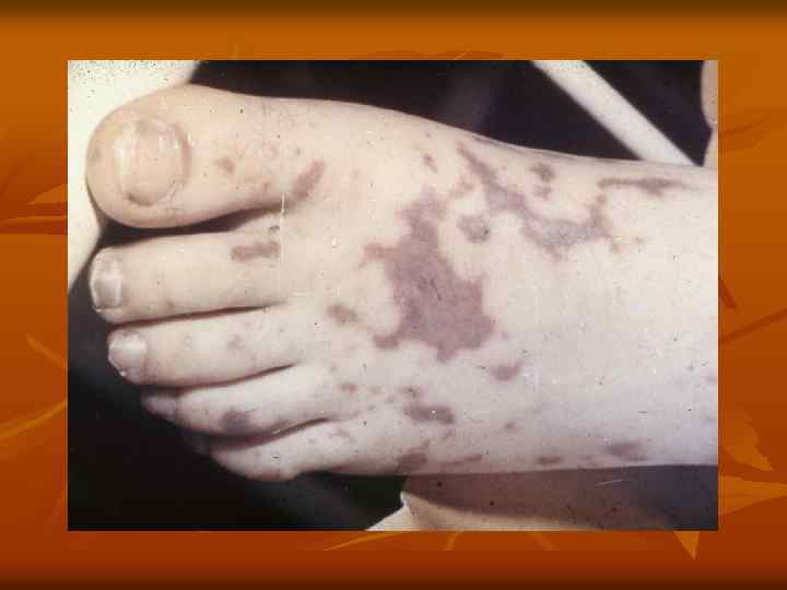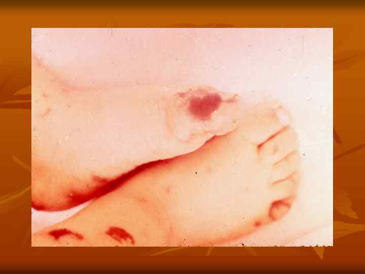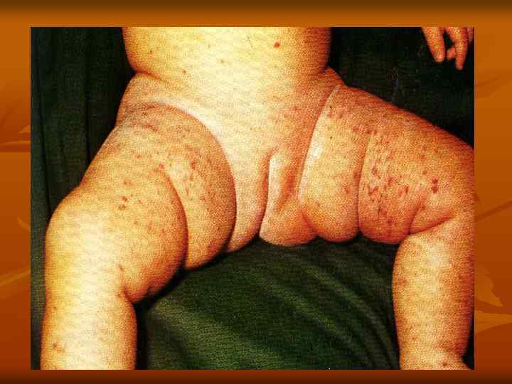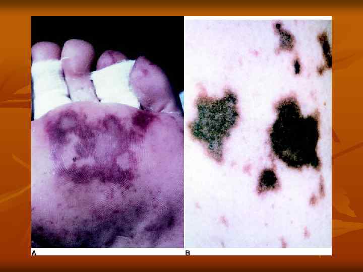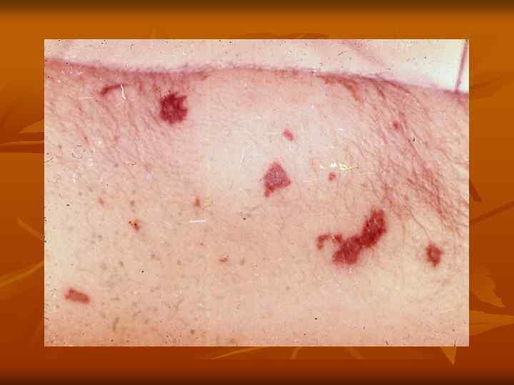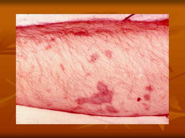 Клиника (продолжение) Менингококкцемия n Начало острое, при тяжёлых формах острейшее. Температура тела повышается до 39 - 41 С, сопровождается ознобом. Лихорадка сохраняется в течение 3 - 4 -х дней, затем снижается до субфебрильных цифр. Одновременно с лихорадкой отмечаются признаки эндогенной интоксикации: головная боль, тошнота, рвота, бледность и цианоз кожных покровов, артралгии, миалгии, жажда, сухость во рту. Отмечаются тахикардия, артериальное давление в начале заболевания несколько повышается, а затем снижается. Может снижаться мочеотделение вплоть до развития анурии. n Звёздчатая геморагическая сыпь появляется в 1 -е сутки развития менингококцемии. По размерам сыпь у одного больного может быть различной: от петехий (до 2 мм), пурпуры (2 - 5 мм) до экхимозов (более 5 мм). При тяжёлых и молниеносных формах возможны обширные кровоизлияния с некрозами кожи, для заживления которых в дальнейшем требуется дерматопластика. Для обширных геморрагий иногда характерен лёгкий перламутровый, стального цвета оттенок на поверхности. Первые елементы сыпи локализуются на ягодицах и нижних конечностях, а затем могут распространяться на туловище, верхние конечности, лицо. Количество, размеры высыпных элементов коррелируют с тяжестью заболевания: чем их больше и они крупнее, тем тяжелее протекает заболевание. Недоразвитие элеменов (синюшние пятна вместо геморагий), появление на лице - прогностически неблагоприятный признак.
