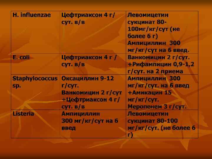 Зависимость этиологии бактериального менингита от возраста пациентов и преморбидного фона Возраст, предрасполагающий фактор Вероятные возбудители 0 – 4 нед. E. coli, L. monocytogenes, K. pneumoniae, Enterococcus spp. , Salmonella spp. 4 – 12 нед. E. coli, L. monocytogenes, H. influenzae, S. pneumoniae, N. meningitidis 3 мес – 5 лет 5 – 50 лет H. influenzae, S. pneumoniae, N. meningitidis, S. pneumoniae старше 50 лет S. pneumoniae, N. meningitidis, L. monocytogenes, Enterobacteriaceae Иммуносупрессия S. pneumoniae, N. meningitidis, L. monocytogenes, Enterobacteriaceae, P. aeruginosa