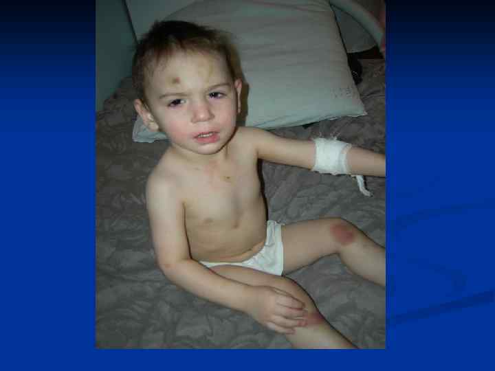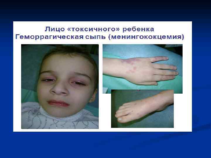 Менингококковый сепсис ( синдром Уотерхауза-Фридериксена) n n n n Токсикоз, гипертермия. Обильная сыпь в первые часы заболевания. Обширные багрово- цианотичные проявления на коже по типу «трупных» пятен. Кровавая рвота, кровавый понос, боли в животе. Резкое падение АД, нитевидный пульс, аритмия сердуа. Анурия. Сосудистый коллапс, кома, смерть.