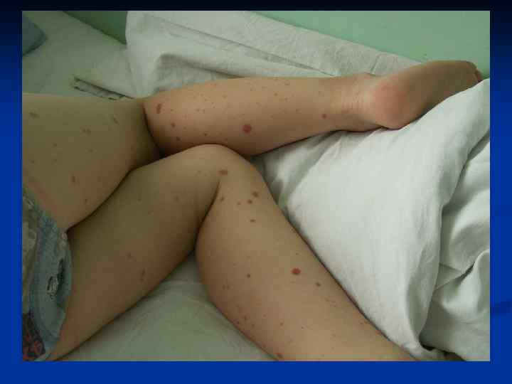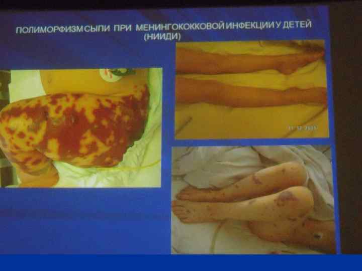 Менингококкцемия Острое начало, лихорадка, жажда, мышечные, головные боли, гиперестезия, повышение АД, тахикардия. n Сыпь : розеолезная, папулезная, геморрагическая ( звездчатая форма) n Крупные геморрагии могут некротизироваться с образованием рубцов. n