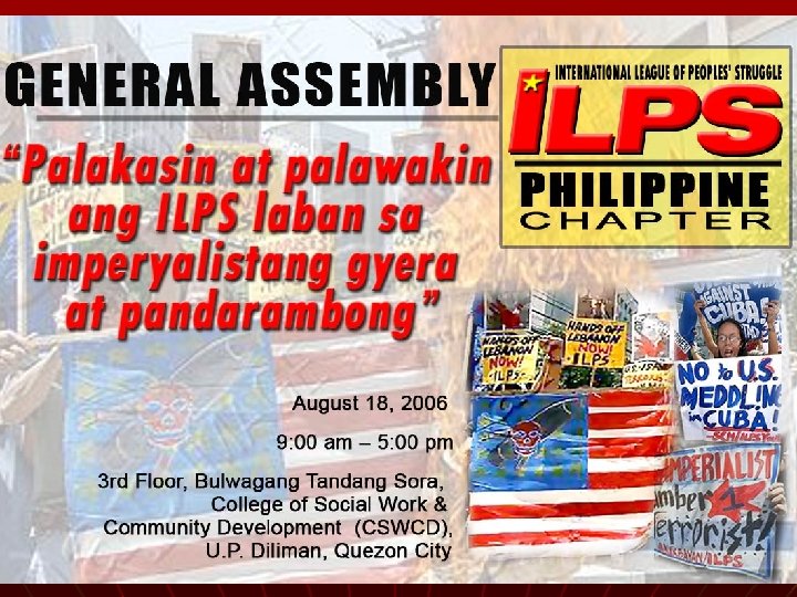 MENSAHE NG PAKIKIPAGKAISA SA ILPS PHILIPPINE CHAPTER IKALAWANG PANGKALAHATANG ASEMBLEYA Prof. Jose Ma. Sison Tagapangulo International Coordinating Committee International League of Peoples’ Struggle 18 Agosto 2006