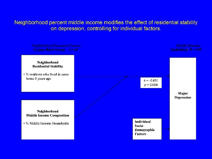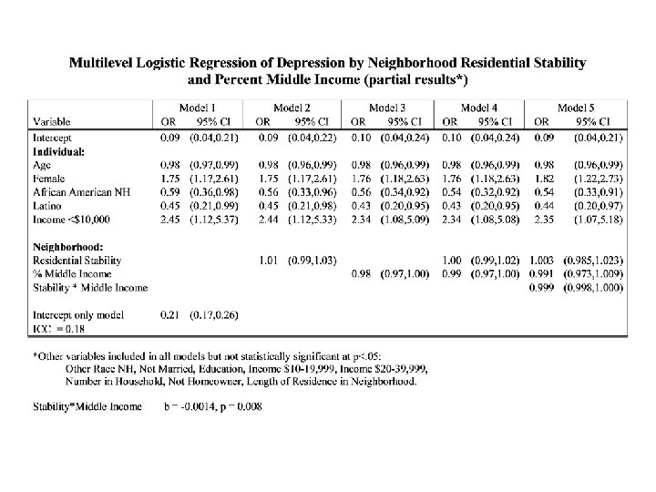 Results: Effects of Interaction of Neighborhood Income and Stability Neighborhood effects l Life Satisfaction ns l Depressive Symptoms ns l Major Depression Significant p=0. 008 Results similar for Neighborhood Middle Income and Poverty: Middle income stronger effect
