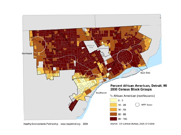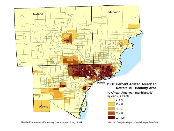 Detroit, Michigan l Historically vibrant, prosperous city l Regional economic restructuring and pervasive racism – Racial residential segregation – Concentration of wealth and poverty 1950 2000 Population (million) 1. 8 16. 2 . 9 82. 3 % African American