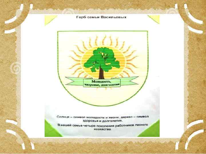 Чтобы нарисовать свой герб необходимо: • вспомнить свою родословную (какие профессии, чем славились); • решить какая будет форма щита (на нем наносится изображение); • определить каким будет основной цвет, поскольку он несет определенный смысл; • и конечно важно задуматься о девизе; без него нельзя, он должен отражать вашу внутреннюю суть.