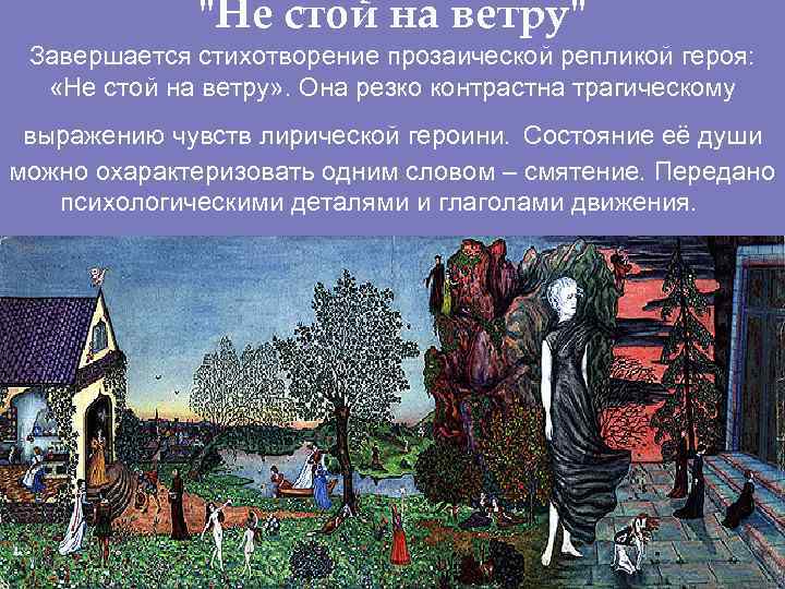 "Не стой на ветру" Завершается стихотворение прозаической репликой героя: «Не стой на ветру» . Она резко контрастна трагическому выражению чувств лирической героини. Состояние её души можно охарактеризовать одним словом – смятение. Передано психологическими деталями и глаголами движения.
