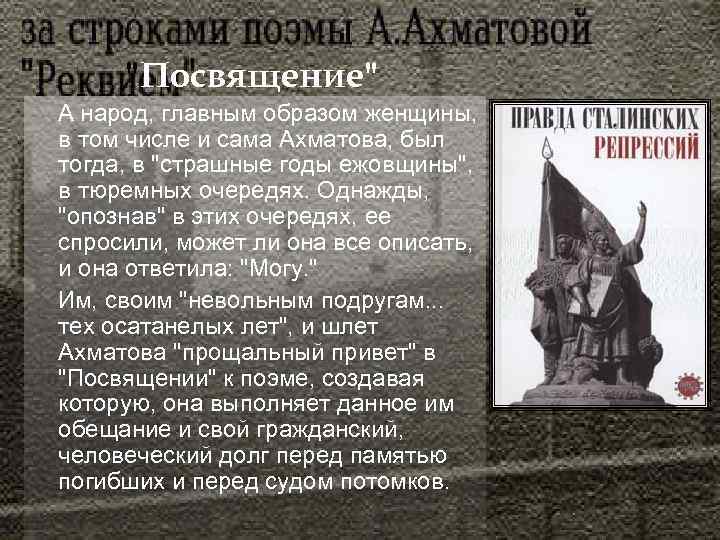 • Наряду с такими известными сегодня произведениями, как книги А. Солженицына, Ю. Домбровского, В. Шаламова, А. Дудинцева, Л. Чуковской, лирическая поэма Ахматовой - достойный и высокий памятник всем тем, кто жил, кто страдал и погиб в ту страшную эпоху сталинского безвременья. Она может быть уподоблена "молитвы пречистому слову" во имя всех пострадавших тогда: • И я молюсь не о себе одной, • А обо всех, кто там стоял со мною.